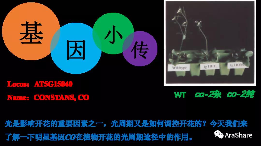 1995年Coupland等人分析12个晚花突变体,并根据这些突变体对春化、日照时间、光质等因素的响应将他们进行分类。其中,co突变体在长日照下比野生型开花晚,在短日照下与野生型开花时间类似,并且对春化响应的敏感度大大降低。他们通过图位克隆的方法首次将CO克隆出来,发现其蛋白序列含有锌指结构域。将CO基因在野生型中过表达发现在长日照下纯合子的开花时间早于杂合子,因此CO在长日照下促进开花还具有剂量效应[1]。