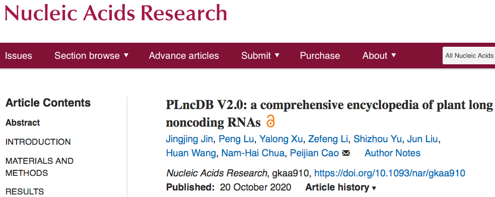 2020年10月20日,Nucleic Acids Research在线发表了中国烟草总公司郑州烟草研究院国家烟草基因研究中心曹培健为通讯作者题为“PLncDB V2.0: a comprehensive encyclopedia of plant long noncoding RNAs”的研究论文。