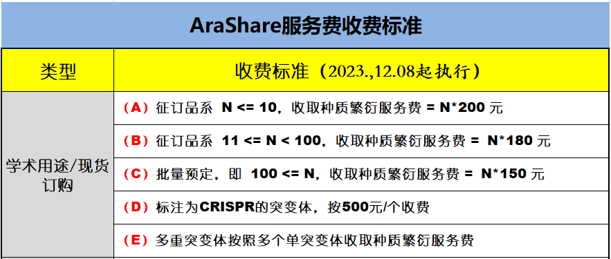 3. 本中心试运行以来,尚未获得政府或公益机构赞助。为了维持本中心运转,持续服务于我国植物科学研究,AraShare不得不收取种质繁衍服务费(特别说明:国外种质中心的基础设施、人员工资由单位承担,还有专项资助,我们与之没有可比性,感谢理解与支持!):