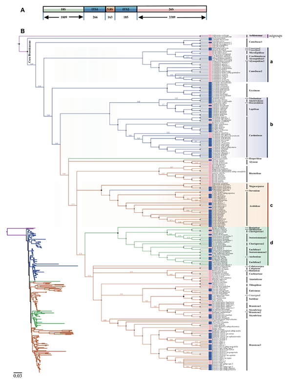 图1 核心十字花科基于nrDNA序列构建的贝叶斯树,右侧为得到支撑a – d分支