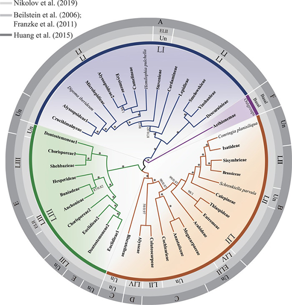 十字花科(Brassicaceae或Cruciferae)植物约有351属3977种,是一个全球分布的自然类群,包括常见绿叶类蔬菜、油料作物油菜、园艺观赏植物香雪球等。该科有模式植物拟南芥,也是被子植物全基因组序列数据发表最多的科之一,为研究全基因组加倍、环境适应机制、基因功能进化等重要生物学问题提供了不可多得的机会。十字花科的分类学研究历史悠久,近年来的分子系统学研究重新界定了十字花科族的划分,并由较早系统的19个族逐步扩增至划分为52个族。由于十字花科复杂的进化历史,且已有研究取样代表不足,核心十字花科的主要分支间以及族间的系统发育关系仍然存在不少问题。